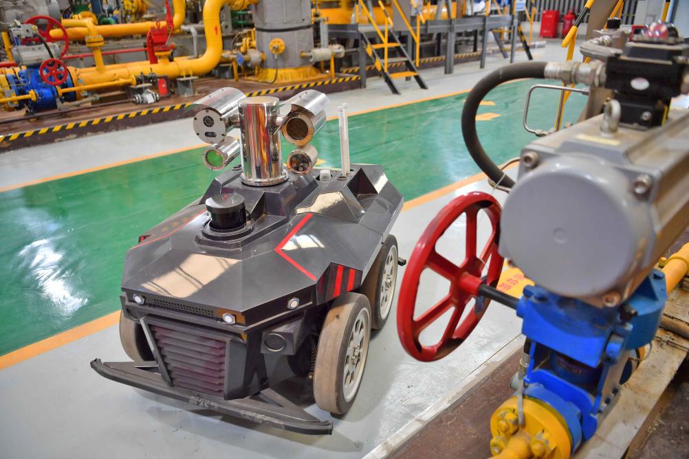 在压缩机房间,防爆轮式巡检机器人正沿着设备下方游走,搭载的高清摄像头和各类传感器实时回传数据,让设备死角一览无遗。在多个阀门管路上,微泄漏激光云台24小时扫描设备流程密封点和关键部位,一旦发现泄漏便会第一时间报警……